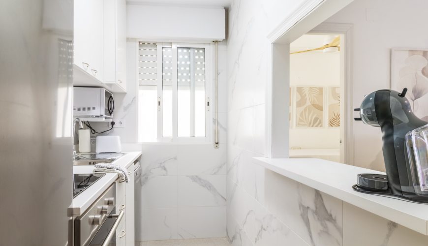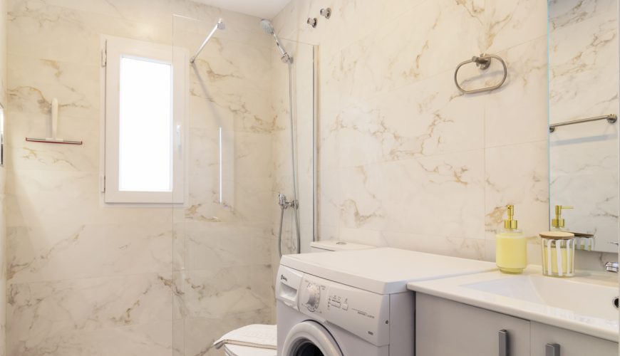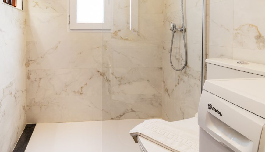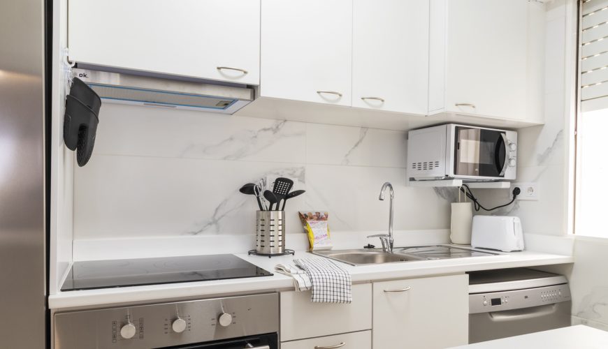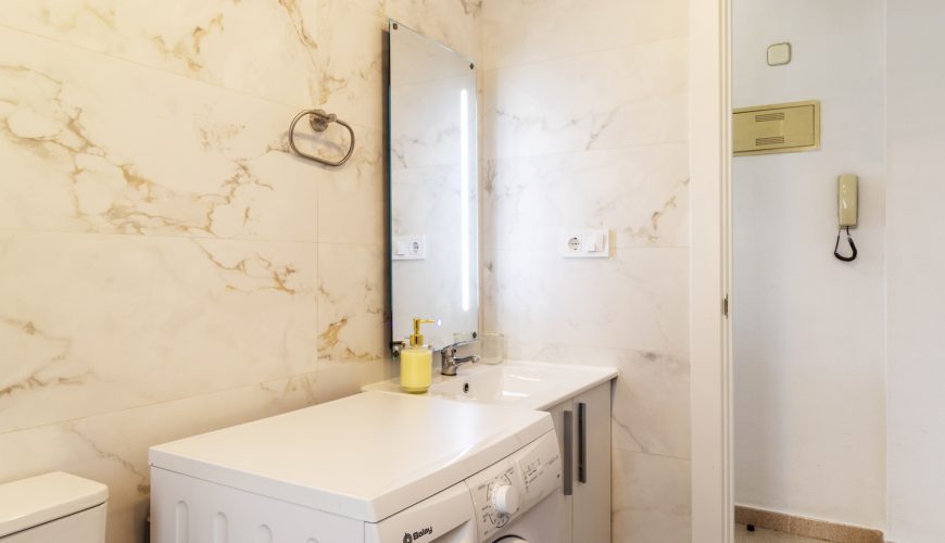 La cocina americana está totalmente equipada, incluyendo lavavajillas y todo lo necesario para sentirse como en casa. El baño, moderno y funcional, dispone de un cómodo plato de ducha.