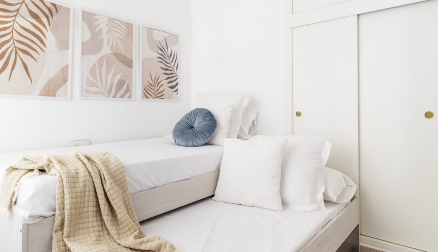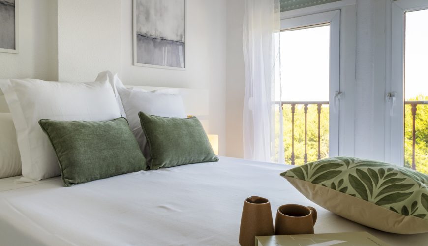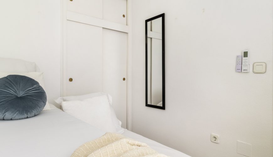 La vivienda cuenta con dos dormitorios: el principal, luminoso y con vistas al exterior, y el secundario con cama nido. Ambos están equipados con aire acondicionado, ventiladores de techo y armarios, pensados para garantizar descanso y frescor en cualquier época del año.