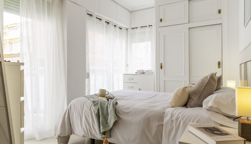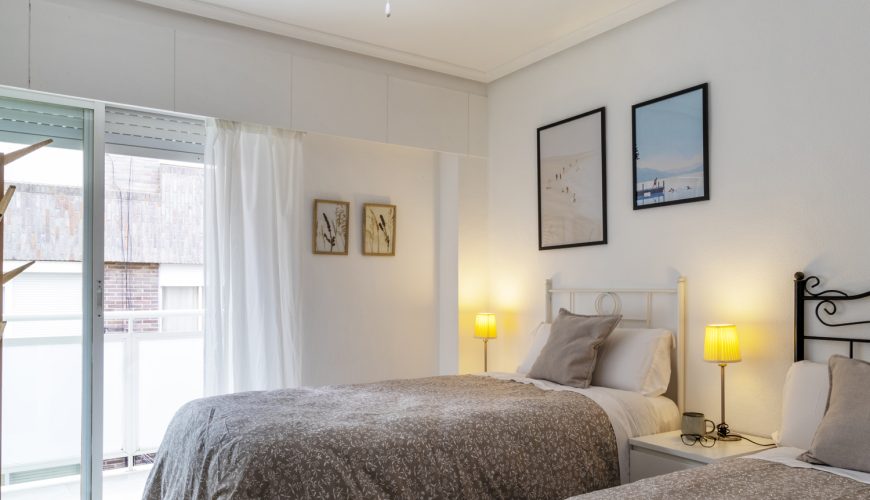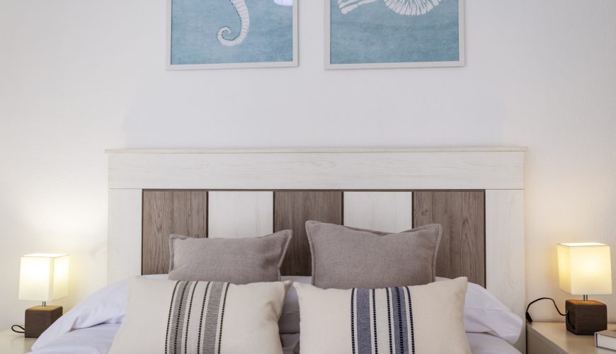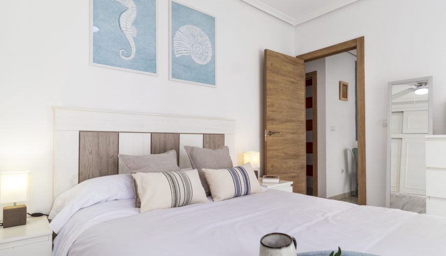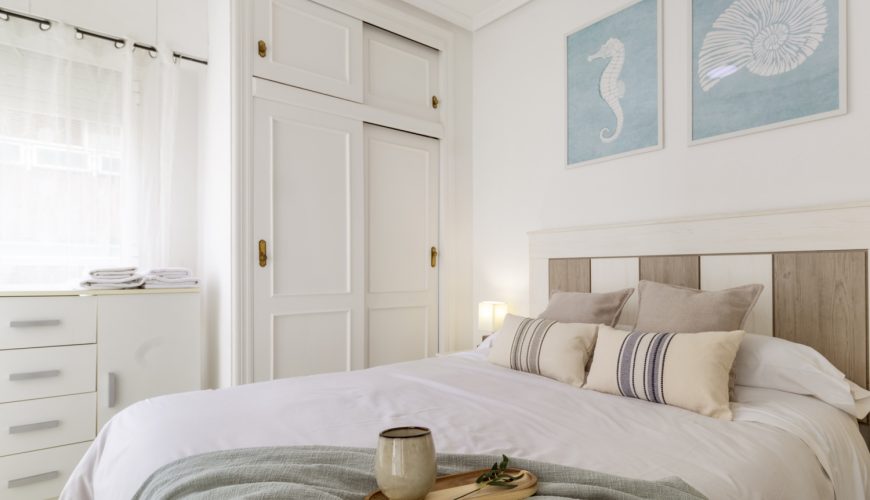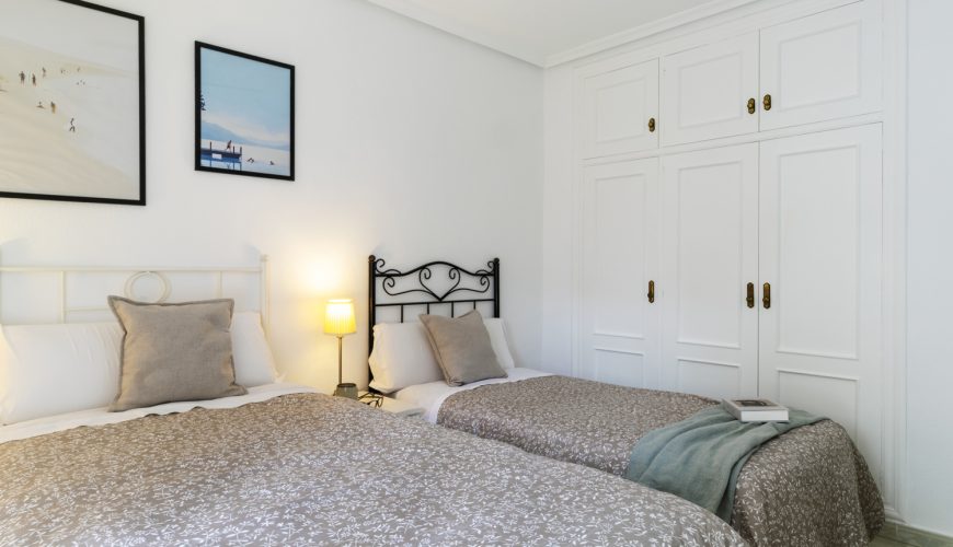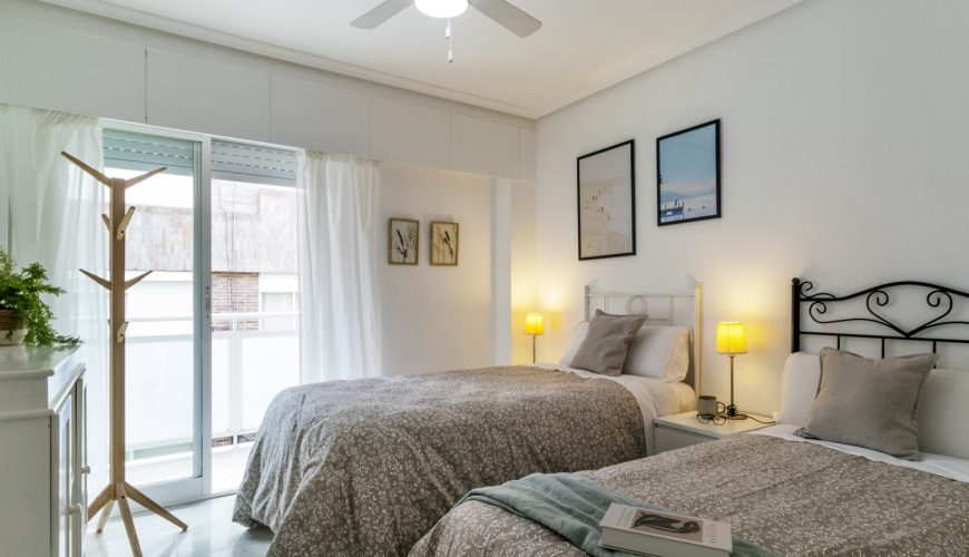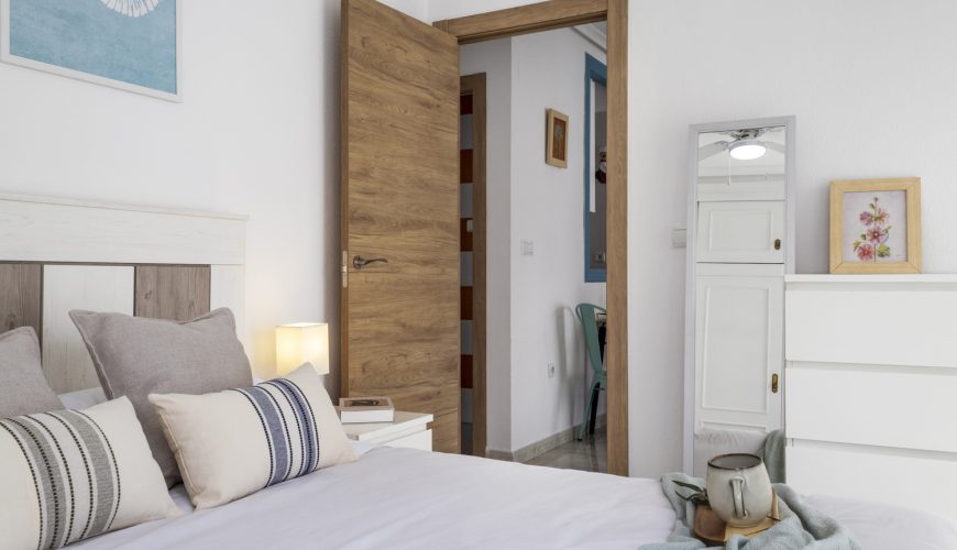 El apartamento cuenta con dos dormitorios, ambos con ventiladores de techo. Uno dispone de cama de matrimonio y el otro de dos camas individuales, con armarios y un ambiente cómodo para descansar. El baño es completo y cuenta con plato de ducha, práctico y funcional.