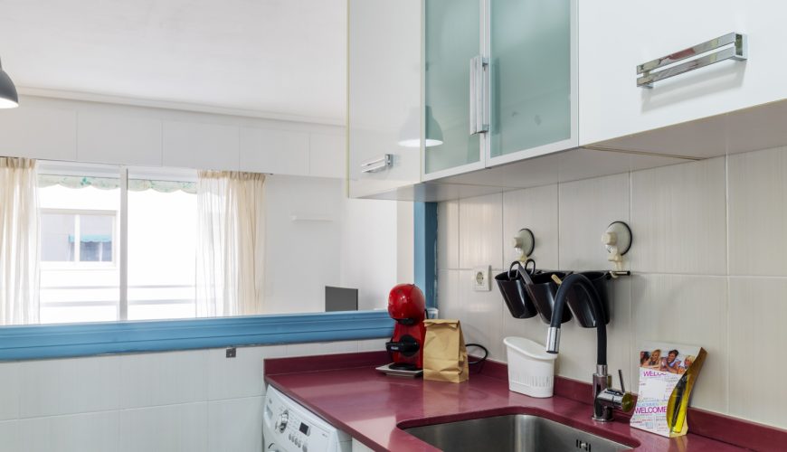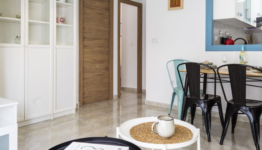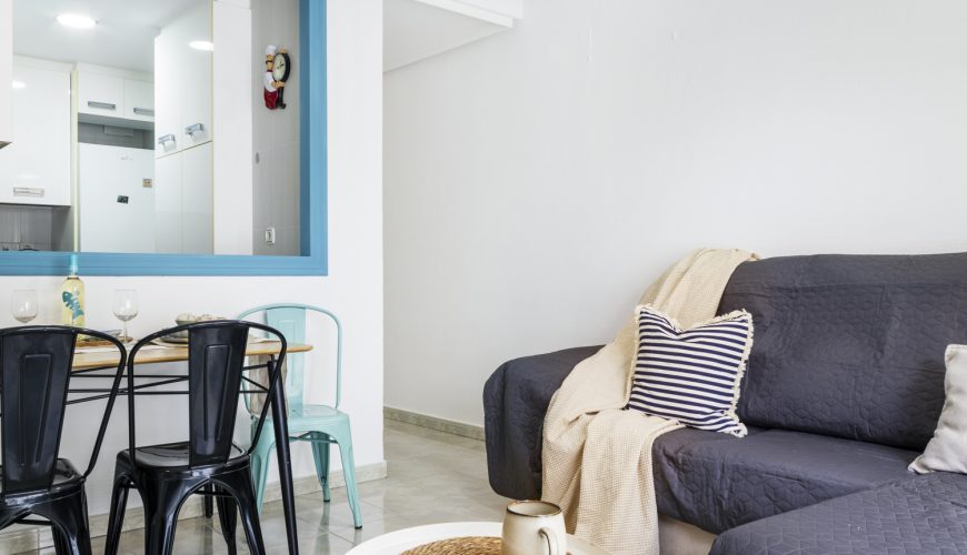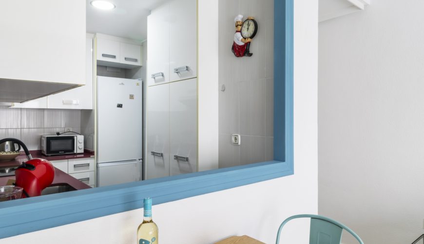 El salón es un espacio agradable y bien distribuido, con aire acondicionado frío/calor y TV con canales internacionales. La cocina americana está totalmente equipada e integrada en el salón, pensada para facilitar el día a día tanto en escapadas cortas como en estancias más largas.